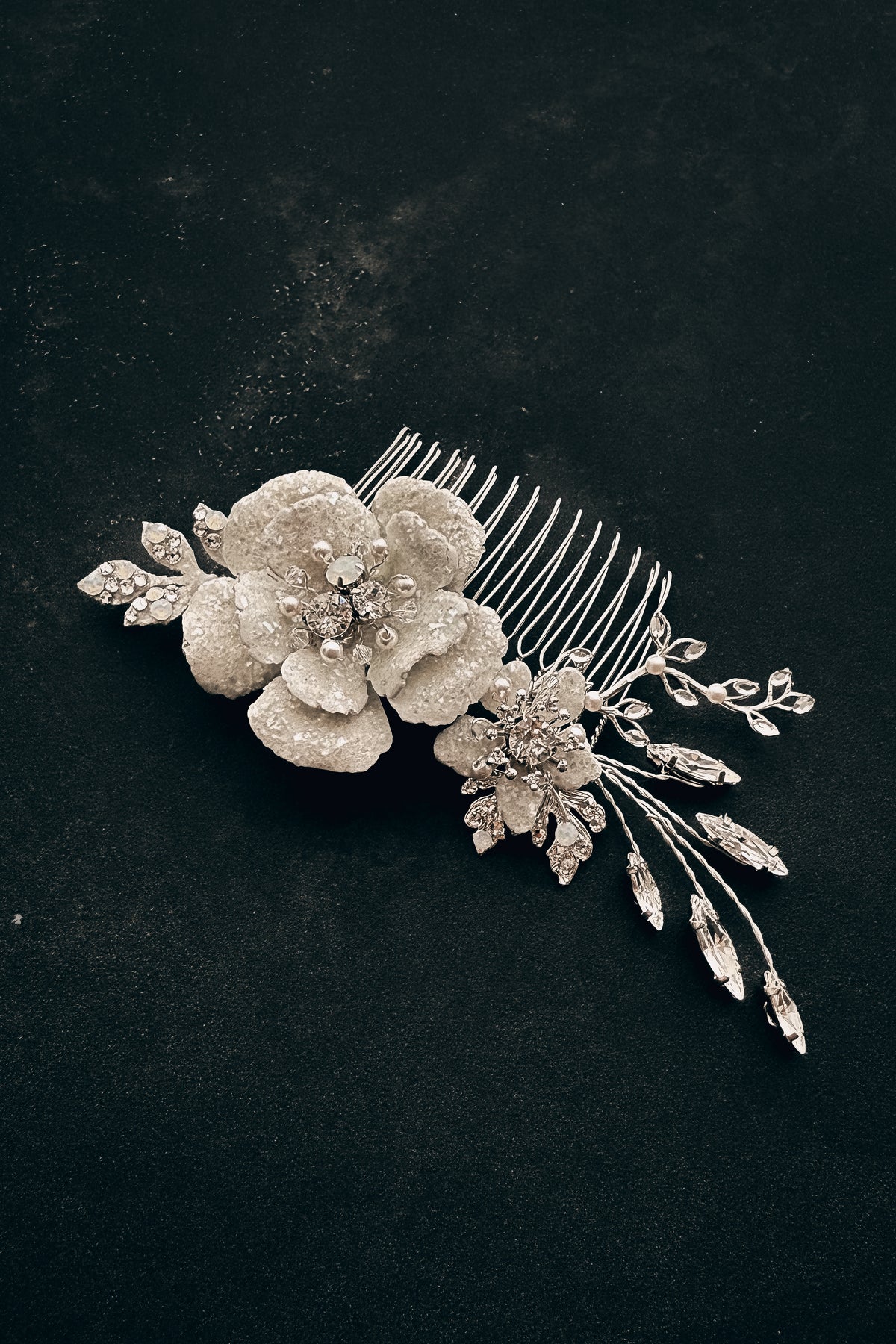 - Irregular mosaic mother of pearl flowers - Numerous Swarovski crystals, opals and pearls - Leaf elements with Swarovski crystals - Metal comb
