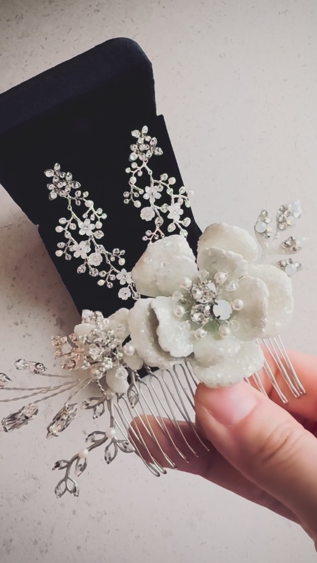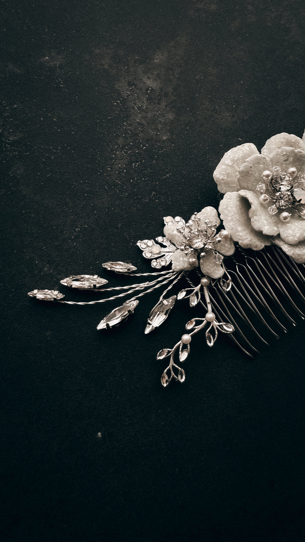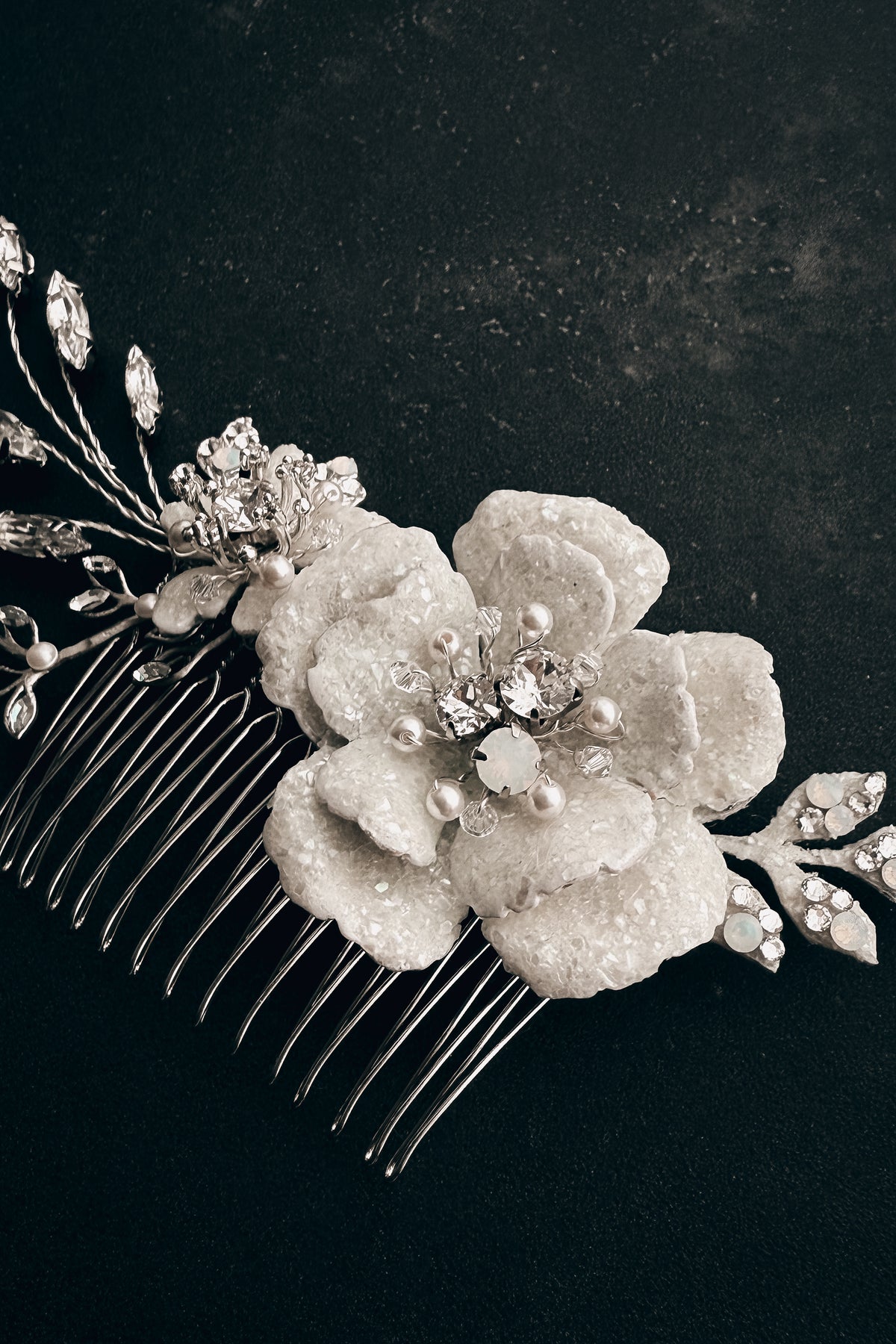 Adorned with shimmering Swarovski crystals, luminous opals, and delicate pearls, TALIA headpiece is a breathtaking statement piece. Its intricate design features beautifully crafted floral elements with our signature irregular mosaic mother of pearl finishes, making it a perfect choice for brides seeking a luxe and unique bridal look. Elevate your wedding style with this exquisite headpiece that captures the essence of elegance and sophistication.