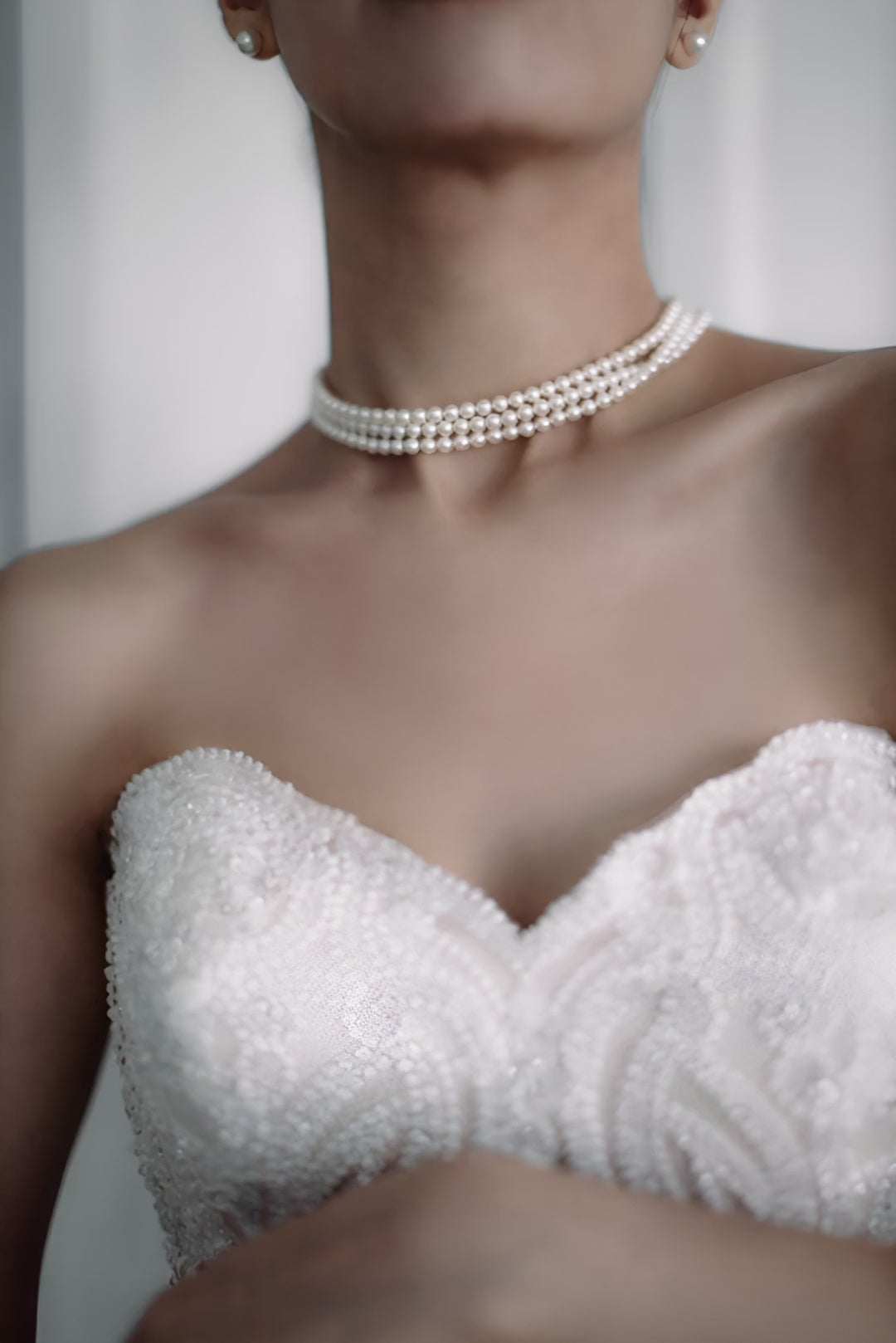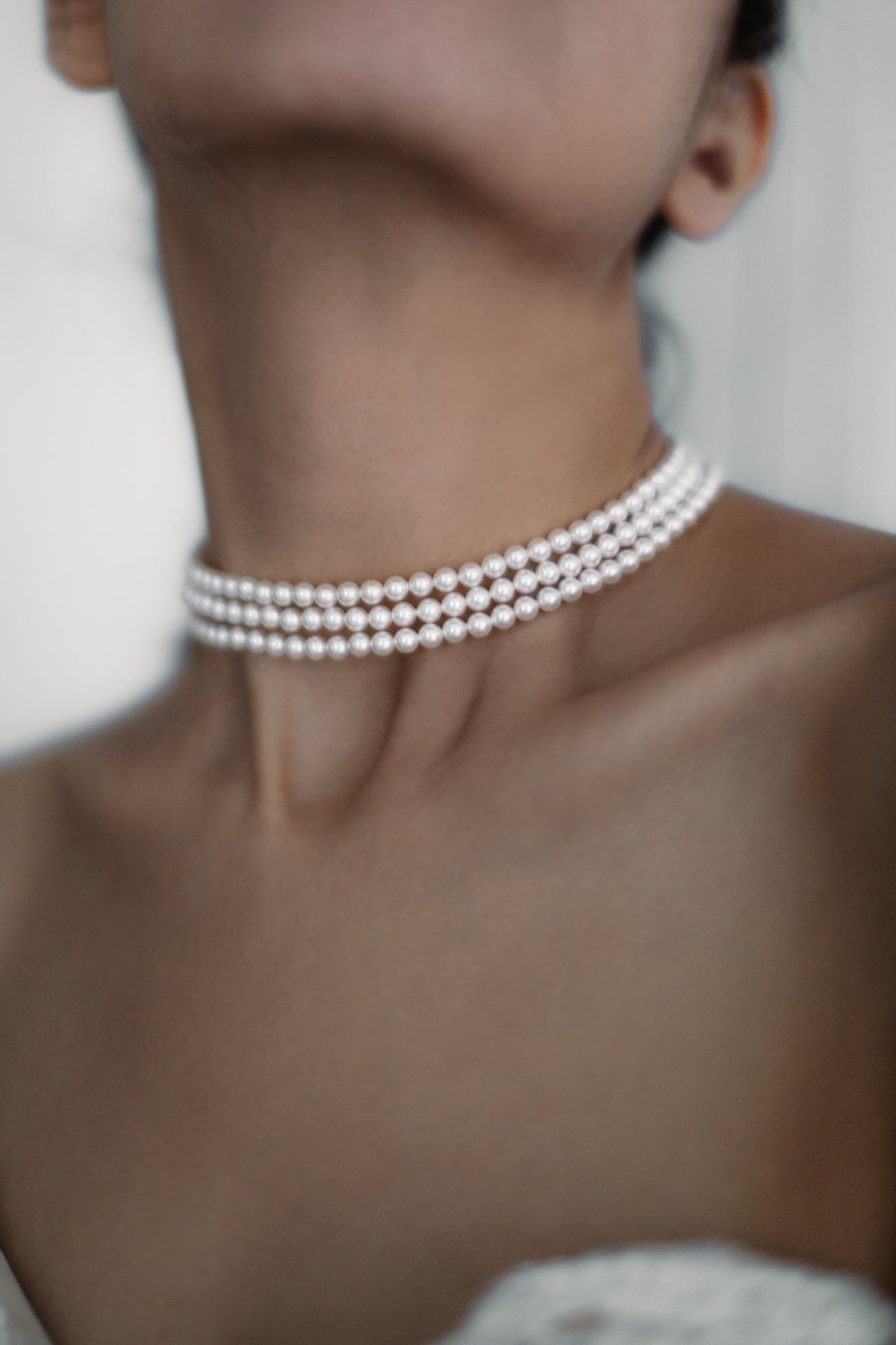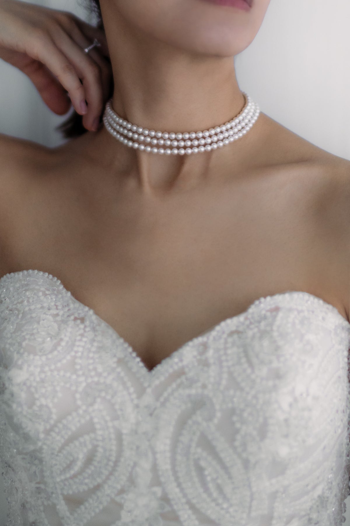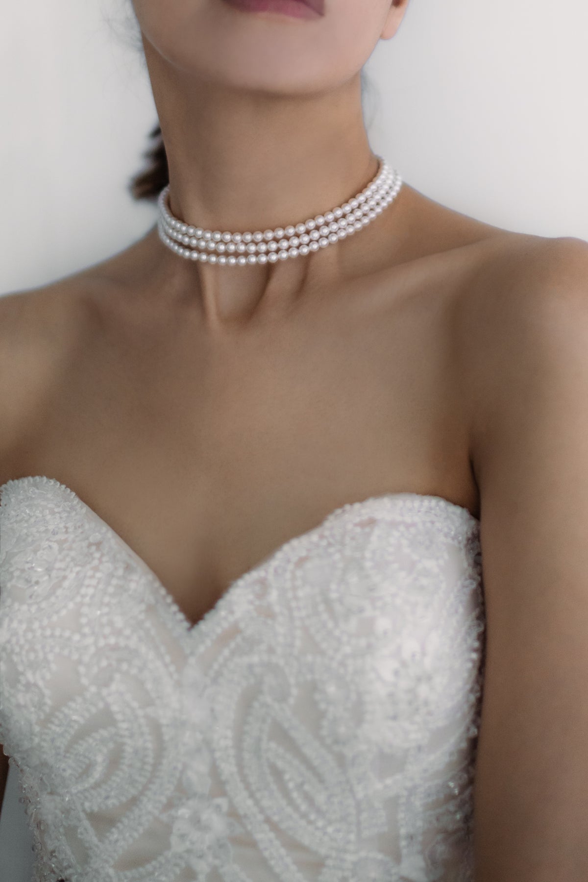 DARLENE is a statement of refined elegance for the bride who dares to be different - a 3-strand 5mm pearl choker designed to sit gracefully at the neckline, offering a timeless yet fashion-forward look. It's elegant, bold, and unapologetically modern. Because timeless doesn't have to mean traditional.