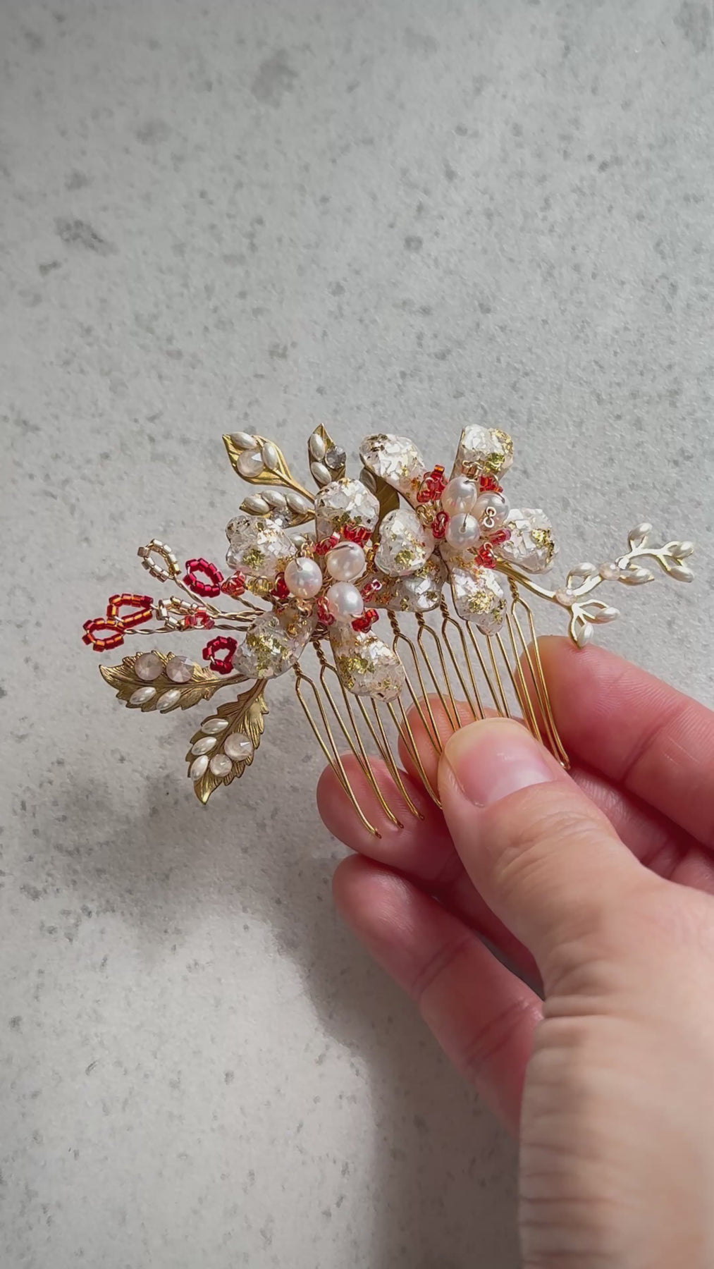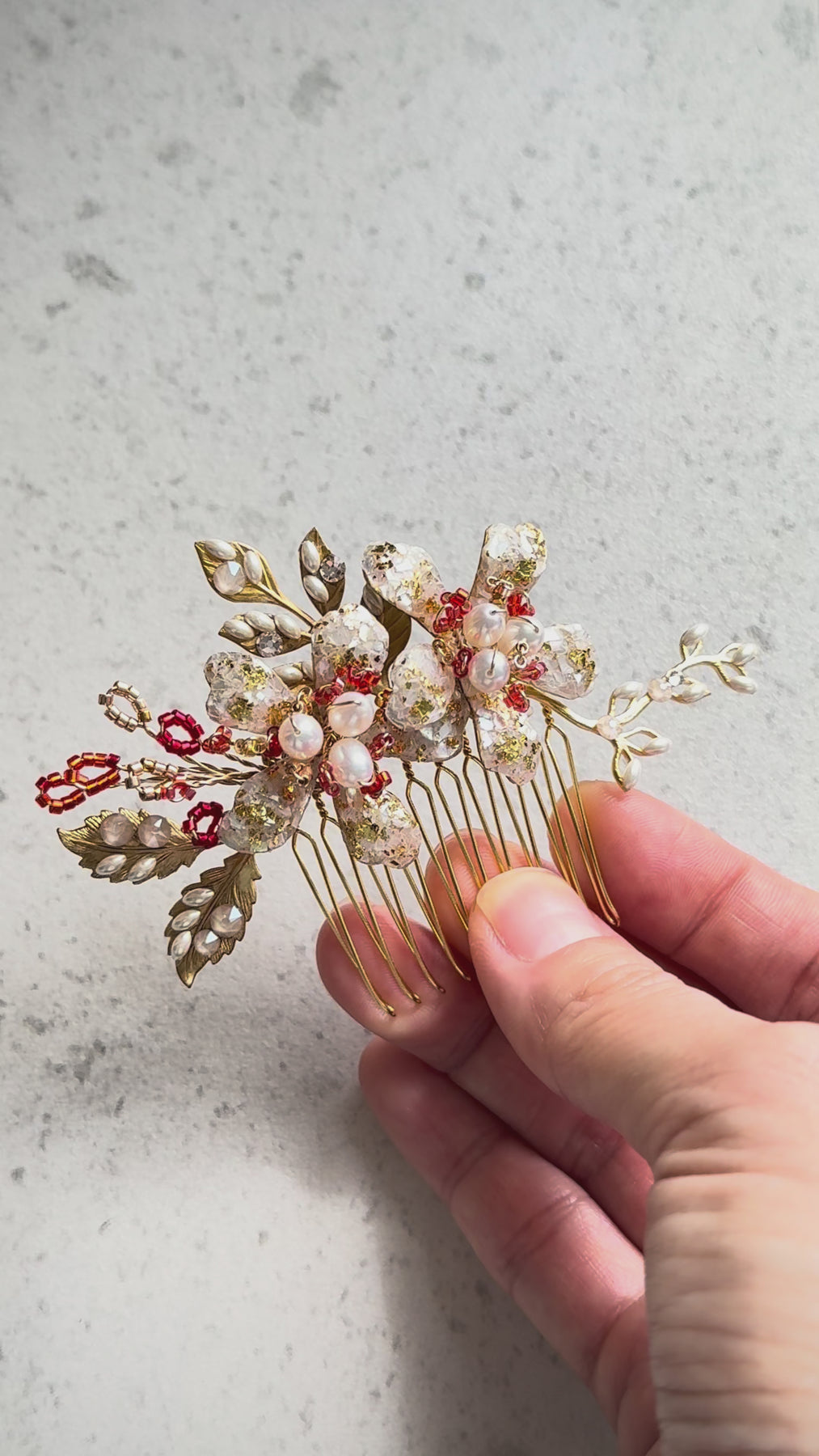 - Irregular mosaic mother of pearl flowers - Numerous Swarovski crystals, opals and pearls - Leaf elements with Swarovski crystals - Metal comb